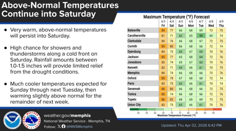 Above-normal temperatures are expected to persist into Saturday, according to weather forecasts. A cold front will bring a high chance of showers and thunderstorms, but it will provide limited relief from ongoing drought conditions.