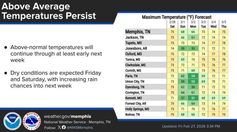 Above-normal temperatures to persist into next week with increased rain chances starting Sunday