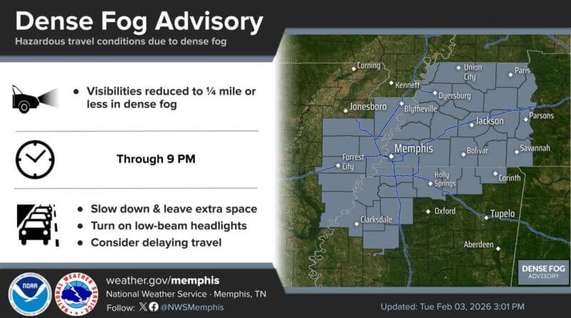 A dense fog advisory is in effect until 9 p.m., according to the National Weather Service. The advisory was issued due to reduced visibility caused by thick fog across the area.