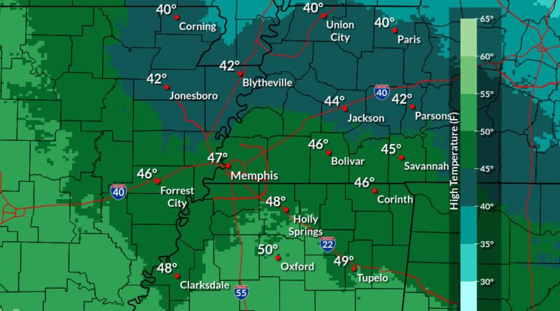A dry cold front is expected to lower temperatures across the region Monday, with highs ranging from the upper 30s to the lower 50s, according to meteorologists.