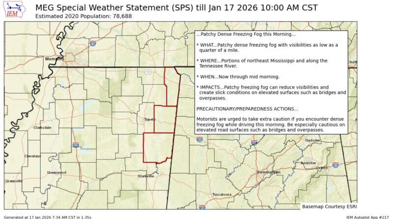 The National Weather Service in Memphis issued a warning about patchy dense freezing fog in northeast Mississippi, primarily along the Tennessee River.