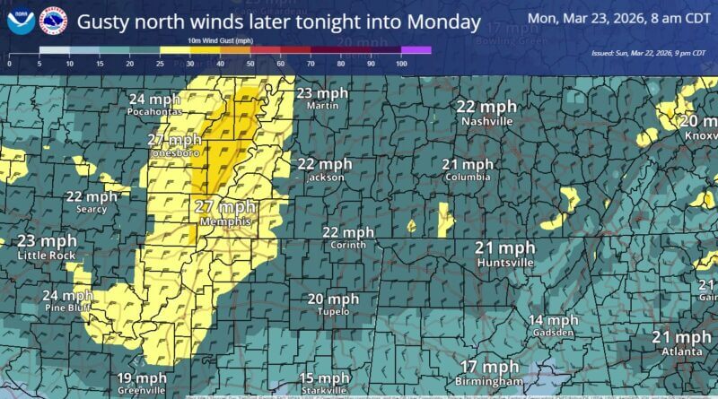 The winds will continue into Monday, bringing cooler temperatures across the region. Temperatures are forecast to be 15 to 25 degrees lower than those recorded Sunday.