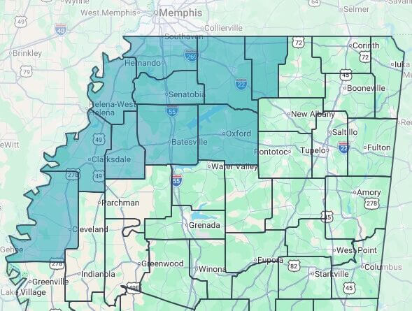 The affected counties are Benton, Bolivar, Coahoma, DeSoto, Lafayette, Marshall, Panola, Quitman, Tate, and Tunica. The report covers state-maintained roads, including interstates and highways, and does not include local roads.