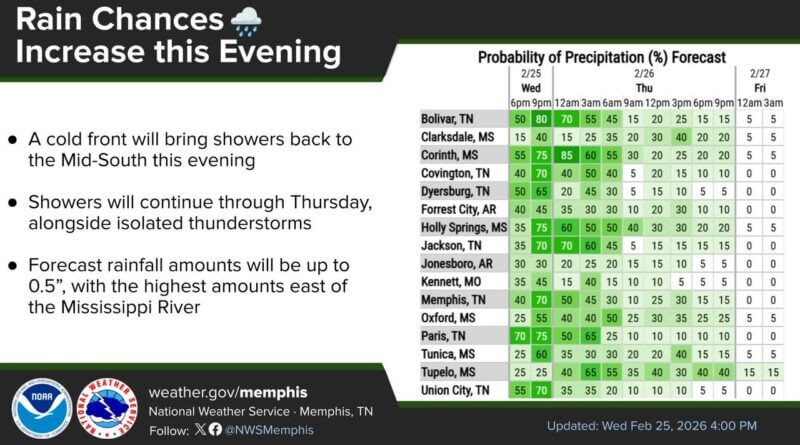 Light Showers Persist Across the Mid-South as Rain Chances Rise