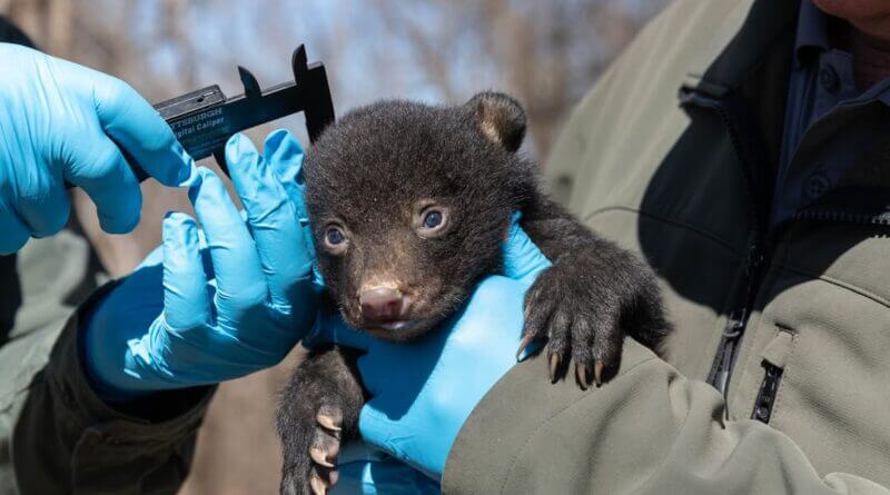 Wildlife staff locate female bears in their winter dens, usually in early March, after cubs are born in late January or early February, the department said. The bears are sedated during the checks, allowing researchers to take measurements and genetic samples from the cubs before returning them to the den and waking the mother.