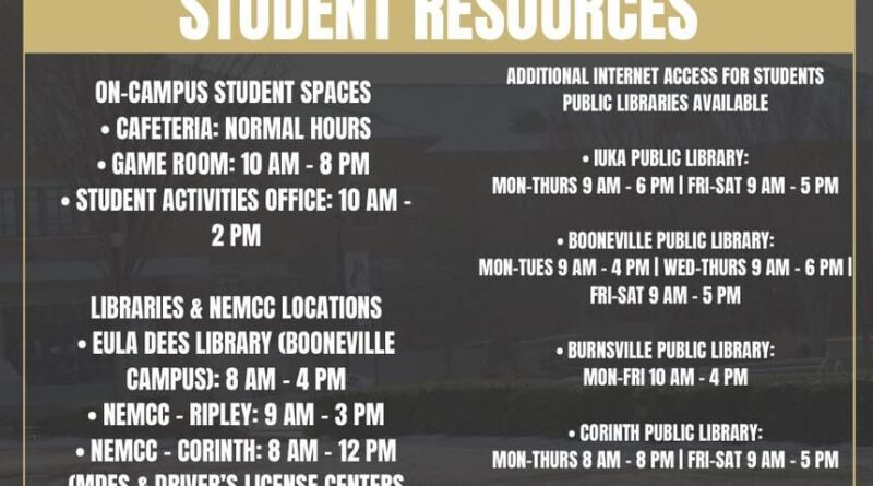 Northeast Mississippi Community College is offering student resources this week, including access to campus spaces, libraries, and internet services. The college encourages students to review the operating hours and plan accordingly.