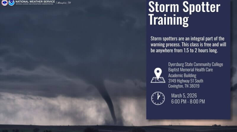 Residents are invited to attend a storm spotter training session scheduled for tomorrow in Covington, Tennessee. The class will start at 6 p.m. at Dyersburg State Community College.