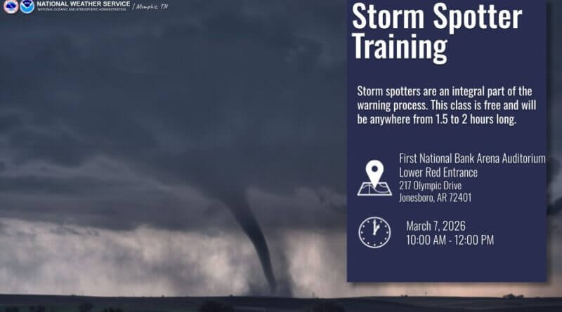 Jonesboro, Arkansas — A storm spotter training session is scheduled for Saturday at First National Bank Arena Auditorium. The class begins at 10 a.m., according to organizers.