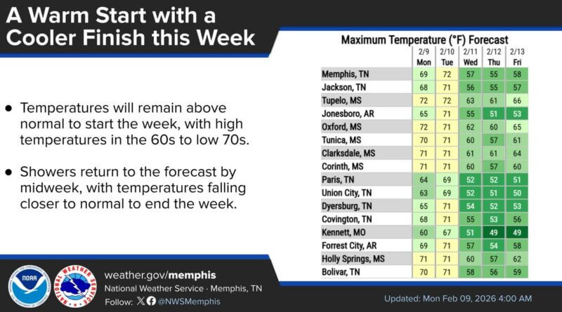 The Mid-South region is forecast to experience a warm and dry start to the workweek, according to weather forecasts.