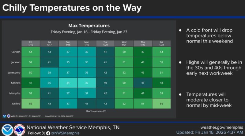 Gusty southwest winds are expected to raise temperatures into the upper 40s and 50s across the Mid-South on Friday, according to weather officials.