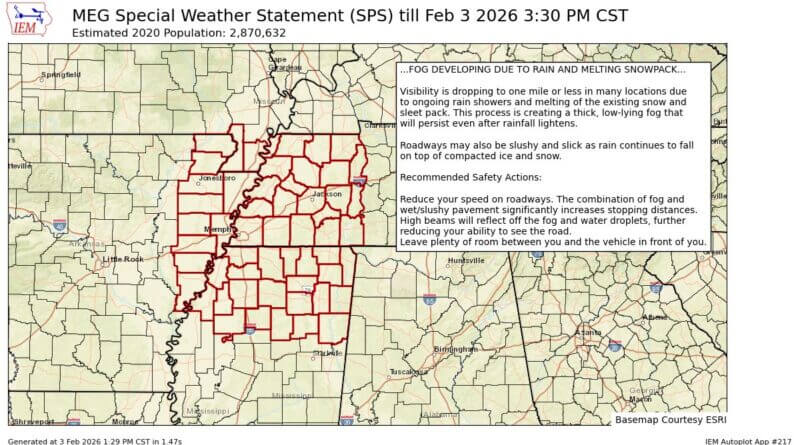 The National Weather Service has issued a Special Weather Statement warning of fog forming in the area due to ongoing rain and melting snowpack. The fog could reduce visibility for drivers and impact travel conditions, officials said.